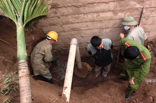 Cảnh sát môi trường đang yêu cầu nhân viên công ty Tungkuang “khai quật” đường ống xả thải ngầm ra sông Cầu Ghẽ (Ảnh: Cục Cảnh sát Môi trường)