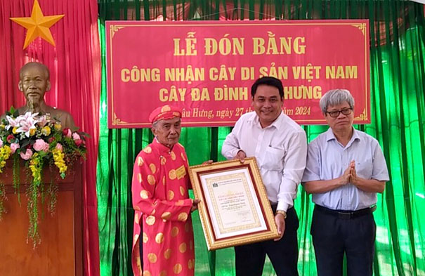 Tại buổi Lễ, thay mặt Hội Thiên nhiên và Môi trường Việt Nam, PGSTS. Phùng Chí Sỹ đã trân trọng trao Bằng công nhận Cây Di sản Việt Nam đối với Cây Đa đình Tân Hưng, ấp Tân Hưng, xã Châu Hưng, huyện Bình Đại, tỉnh Bến Tre theo Quyết định số 02/QĐ-HMTg ngày 02/01/2024 của Hội Thiên nhiên và Môi trường Việt Nam. Đây là một sự kiện quan trọng, một tin vui lớn ngay những ngày đầu năm mới 2024 và chuẩn bị đón Tết Giáp Thìn của bà con nhân dân quê hương Kiến trúc sư Huỳnh Tấn Phát. Cây Đa đình Tân Hưng là cây Di sản Việt Nam đầu tiên của huyện Bình Đại, cây Di sản Việt Nam thứ 5 của tỉnh Bến Tre (4 cây Di sản còn lại, ở Ba Tri 2 cây, Tp. Bến Tre 1 cây và huyện Mỏ Cày Nam 1 cây).