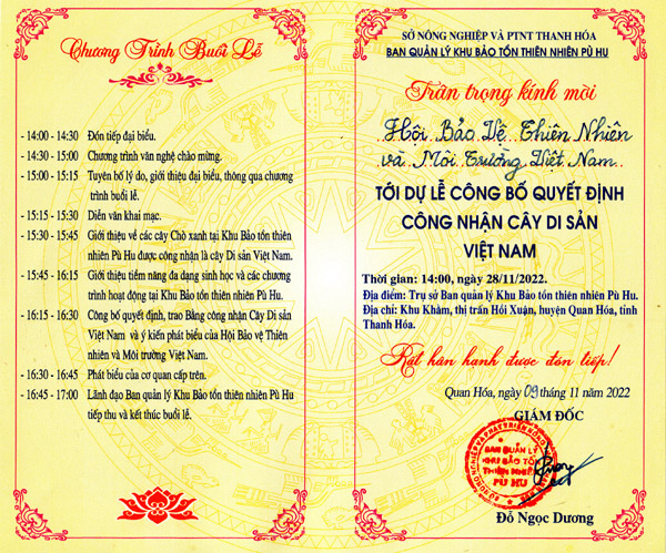 Giấy mời tham dự Lễ đón Bằng công nhận Cây Di sản Việt Nam tại Khu bảo tồn thiên nhiên Pù Hu, Hồi Xuân, Thanh Hóa