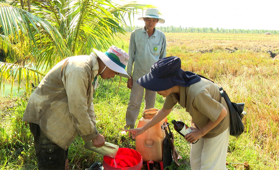 Thành viên dự án của VACNE đang hướng dẫn nông dân sử dụng chế phẩm vi sinh